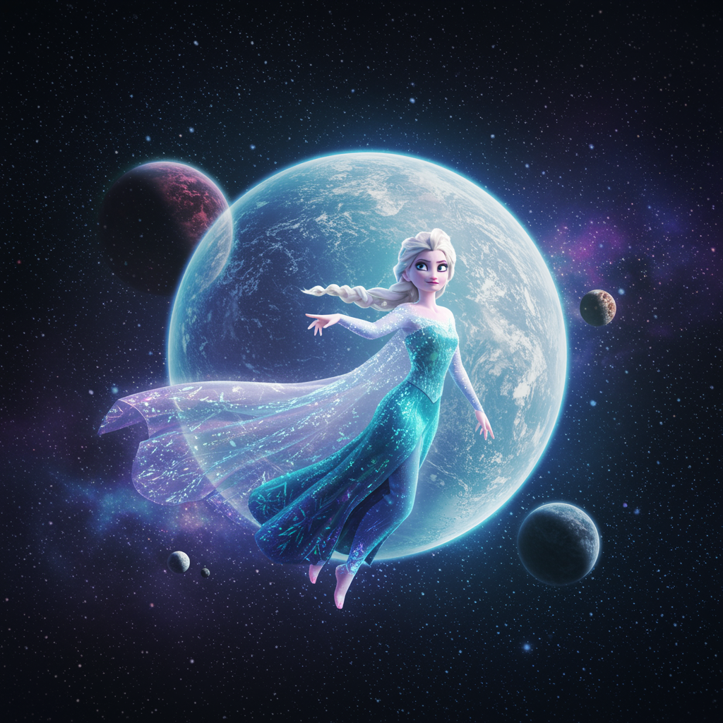 A hyper realistic image of Elsa resembling a celestial deity soaring through the cosmos, surrounded by vibrant planets, her figure majestically gliding before an enormous, mystical ice planet. Elsa is adorned in ethereal attire, shimmering with cold space hues and neon luminescence against the dark void. Her features are powerful and divine, exuding an aura of god-like presence amidst the high-detail, enchanting cosmic scenery.