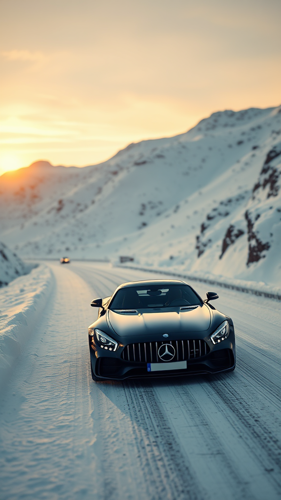 A hyper realistic luxury black Mercedes sports car cruises along a snowy mountain highway, its sleek form contrasting sharply against the glistening white landscape, reflecting the golden hues of a setting sun while leaving a delicate trail in the untouched snow.