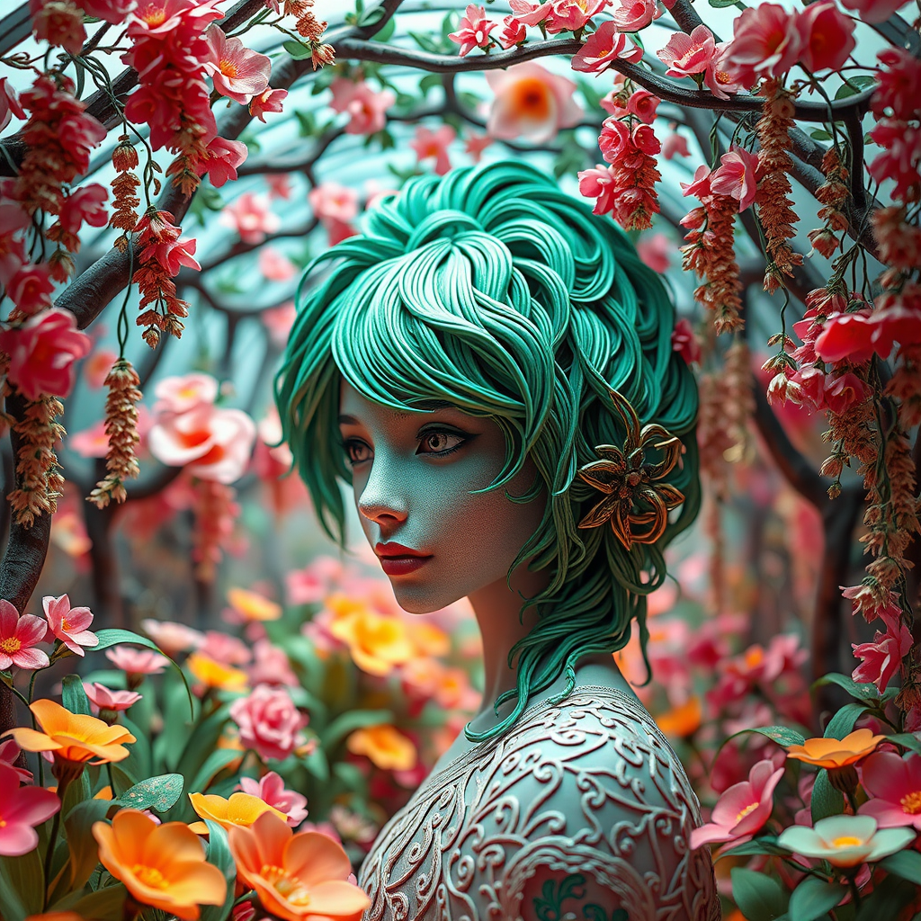 A hyper realistic macro render of a green paper multi-strand haired woman, intricately engraved with sharp focus from a shallow angle view. She exudes innocence beneath an ornate floral atrium, surrounded by a vibrant color palette in a garden filled with flowering plants. Overhanging trees and hanging engraved vines create a picturesque diorama effect. The scene is bathed in volumetric lighting, showcasing color gradients and featuring an infinite vanishing point with complex parallax layers.