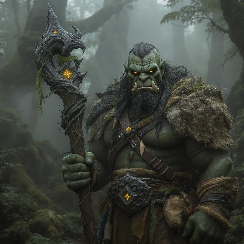 A hyper-realistic male orc druid stands in an ancient forest shrouded in light fog, illuminated by dramatic lighting that casts intricate shadows on his rugged, weathered features. His deep green skin is textured with age and adorned with tribal tattoos and natural elements, blending seamlessly with the lush environment. Long, tangled hair and a scruffy beard frame piercing eyes filled with wisdom and ferocity. He is garbed in earthy, weathered robes made from moss and leaves, carrying a carved wooden staff entwined with vines and glowing runes. The scene is rendered in 4K detail, showcasing extreme realism and capturing the ethereal and mystical atmosphere, reminiscent of artwork by J.M.W. Turner, as if created within the powerful rendering capabilities of Unreal Engine 5.