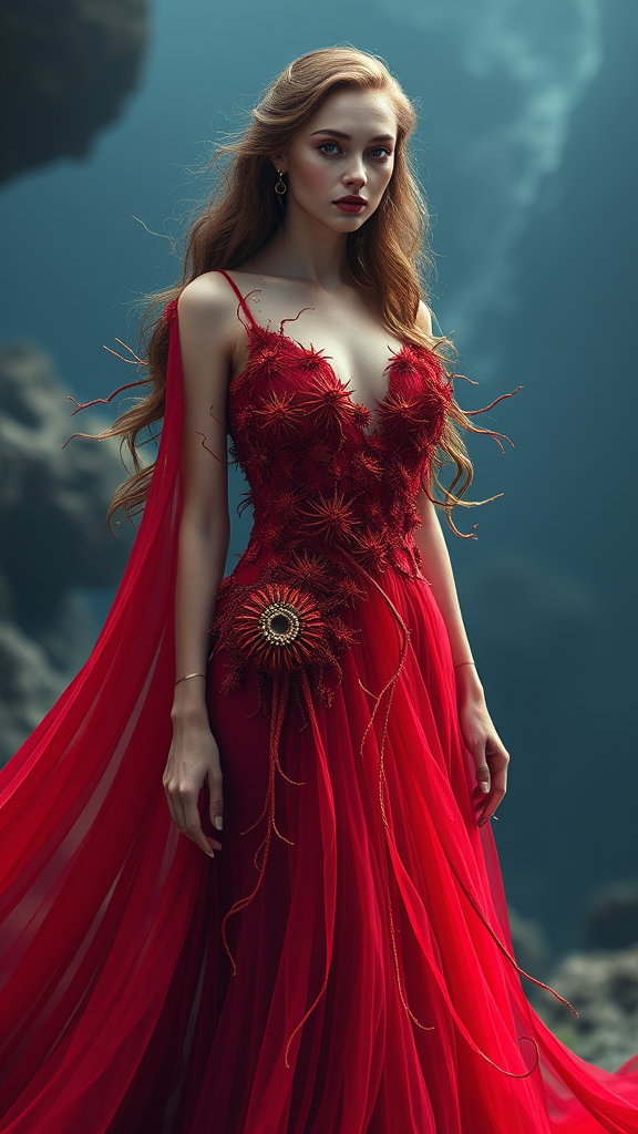 A hyper-realistic model with goddess-like features is portrayed in a highly detailed portrait photography, capturing the depth of field. She wears a magnificent vivid crimson gown, its long flowing fabric crafted intricately from red sea urchins and delicate anemone tendrils. The dress exudes an organic elegance, as if alive, enhancing her divine presence. Her hair, cascading in waves, adds to the ethereal aura. The full-body composition is set against a backdrop that complements the rich textures and colors of her attire, resulting in a striking visual narrative.
