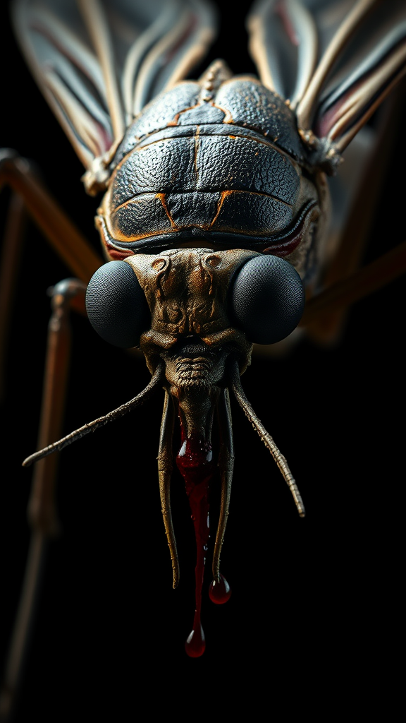 A hyper-realistic mosquito looms menacingly in the dim light, its intricate, high-detail skin shimmering with an unsettling gloss. The setting is eerily atmospheric, steeped in horror, as shadows play across its form. Blood drips ominously from its razor-sharp proboscis, pooling beneath its glistening, black dead eyes that seem devoid of life. Its body bears the marks of countless battles, crisscrossed with scars that tell stories of survival. Large, menacing fangs protrude from its jaws, adding to its terrifying presence. The dark background cloaks the scene in mystery, heightening the spine-chilling atmosphere as the viewer is drawn into this close-up exploration of dread.