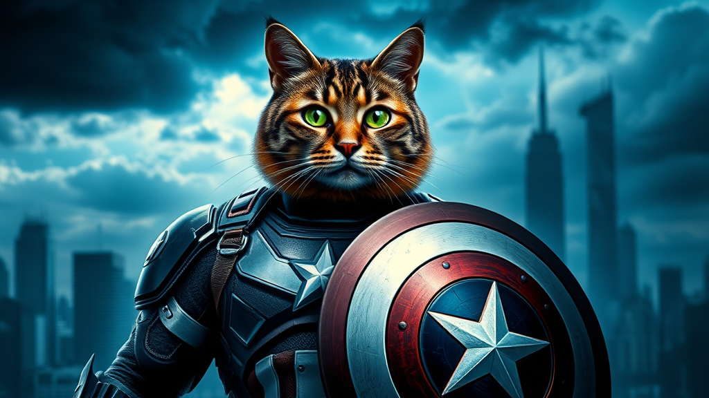 A hyper-realistic movie poster features an anthropomorphic character with the head of a majestic tabby cat, its fur gleaming with intricate details. The character stands heroically, clad in armor reminiscent of Captain America, complete with a shield that boasts a unique feline emblem. The background is rendered with octane precision, highlighting a dramatic cityscape under a stormy sky. The palette blends navy blues and shimmering silvers, contrasted by the vibrant green of the character's cat eyes. This cinematic vision artfully blends creature and hero, capturing the essence of valor without depicting traditional human elements.