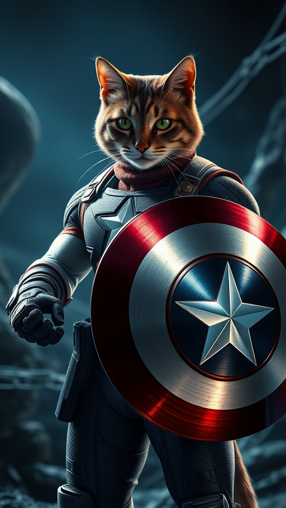 A hyper-realistic movie poster featuring an anthropomorphic character with the head of a cat and a muscular humanoid body, reminiscent of a superhero akin to Captain America. The feline hero holds a brilliantly detailed shield, its surface gleaming as if lit by an intense spotlight. The scene is rendered in octane for stunning detail and depth, with a dramatic and bold color palette that highlights the character's heroic stance. The environment reflects a surreal, otherworldly setting, adding an intriguing twist to the classic superhero theme.