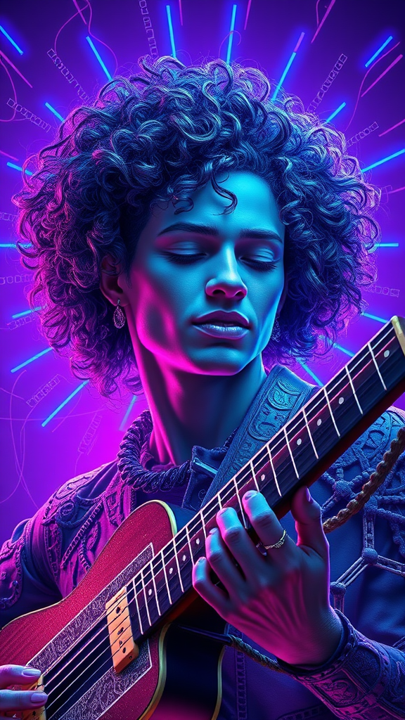 A hyper-realistic musician with curly hair, radiating a vibrant true blue light, crafted in the style of Beeple. The scene is pulsing with bright gray and electric purple hues, featuring intricate patterns and sculpted details. There are complex networks and delicate layers woven throughout, adding depth to the composition. The musician is set against a dramatic backdrop, emphasizing the contrast and intensity of their presence.