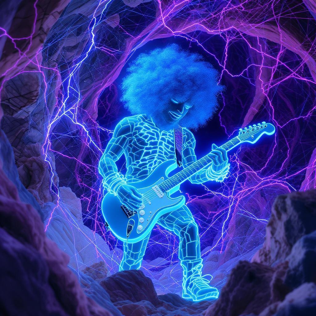 A hyper-realistic musician with curly hair, reminiscent of Beeple's style, radiating a vibrant true blue glow. The figure stands amidst an intricate design, blending sculptural details with complex patterns. The scene is highlighted with bright gray and electric purple hues, weaving through the composition like delicate, interconnected networks. Layers of texture add depth, revealing exquisite craftsmanship while maintaining the core essence of artistic innovation.