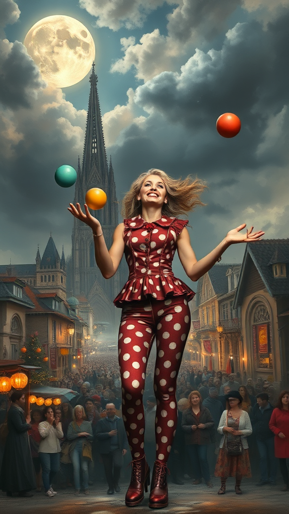 A hyper-realistic oil painting of a woman with a kind smile, embodying the spirit of a pin-up clown. She stands confidently in a crowded city with a grand cathedral looming in the background. The cityscape is alive with activity under an ominous sky partially shrouded by clouds, and a full moon casts an ethereal glow, enhanced by volumetric lighting. She is juggling colorful balls with grace, wearing playful polka-dot leggings that add a touch of whimsy to her outfit. The scene is imbued with a sense of happiness and generosity, reminiscent of the artistic style of Frank Frazetta.