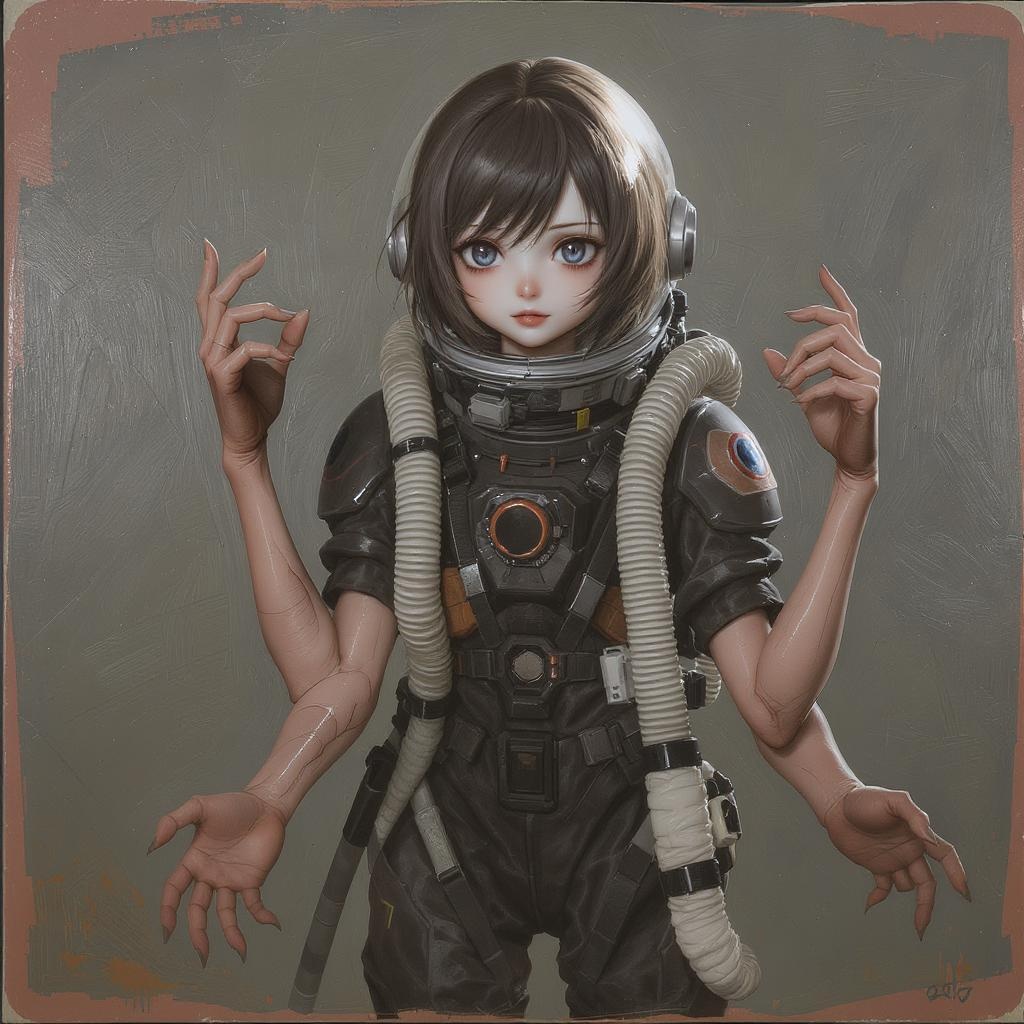 A hyper realistic painting of a stunning girl in an EVA plugsuit, intricately detailed, in the style of anime, inspired by Greg Rutkowski, trending on ArtStation CGI. The artwork features a doll-like appearance with an Octane render finish. The composition includes intentional elements of bad anatomy, with blurry and fuzzy textures, featuring extra arms and fingers. The scene depicts poorly drawn hands that appear disfigured, alongside elements of tiling, giving the impression of a deformed and mutated form, adding a surreal and intriguing dimension to the artwork.
