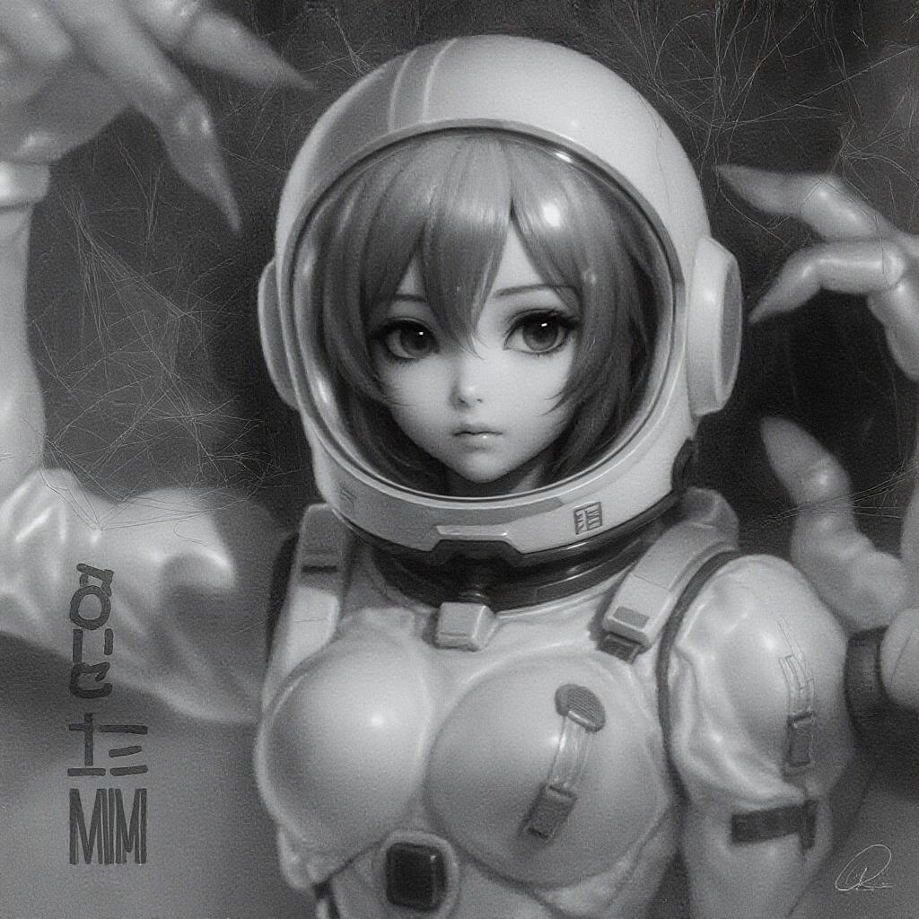 A hyper-realistic painting of a stunning girl in an EVA plugsuit showcases intricate anime-inspired details, reminiscent of Greg Rutkowski's style. The artwork features a surreal 3D-rendered, doll-like figure with a plastic sheen, enveloped in blur and haze, creating a monochrome, black and white aesthetic. The image is intentionally crafted with JPEG artifacts and a low-resolution quality, evoking a sense of imperfection and fragility. Elements of distortion are present, such as malformed anatomy with too many fingers and tentacle-like arms, conveying an abstract design. Subtle hints of a watermark and logos are visible, blending into the imperfect canvas, while maintaining a balance between bad proportions and intriguing artistic intent.