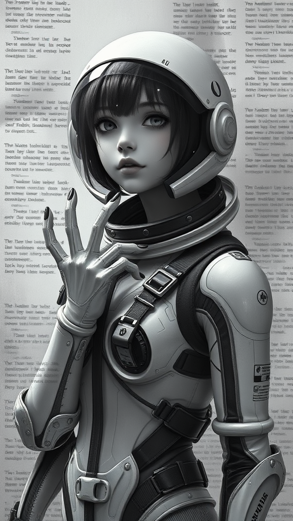 A hyper-realistic painting of a stunning girl wearing an EVA plugsuit, incredibly detailed in the anime style, as if painted by Greg Rutkowski, featured prominently on ArtStation. The image is intentionally imbued with jpeg artifacts adding a layer of low quality and low resolution, creating a 3D effect. Her appearance is reminiscent of a delicate doll, with a plastic-like sheen, surrounded by an atmosphere of blur and haze. The piece is rendered in monochrome, black and white, with cryptic text in the background and a watermark subtly visible. Her hands appear creatively abstract, seemingly mangled with extra fingers or tentacle-like distortions, suggesting an otherworldly presence. Her form is artistically exaggerated, with some limbs partially obscured or absent, adding a surreal touch to the composition. The anatomy is intentionally offbeat, with unconventional proportions that engage the viewer's imagination.
