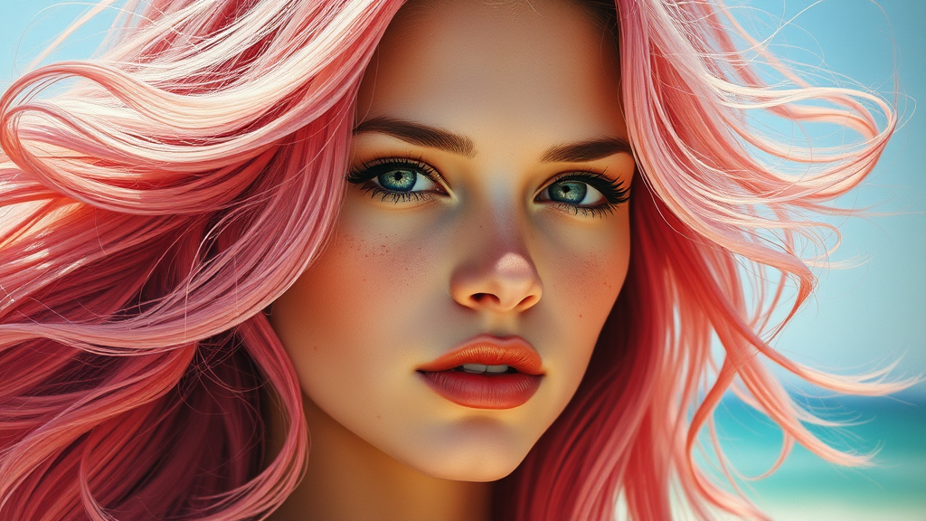 A hyper-realistic painting of a woman with flowing pink hair, reminiscent of a young Liv Tyler, graces the cover of a prestigious art magazine. Her sun-kissed skin glows with a natural, golden hue. Soft freckles scatter across her perfectly symmetrical face, enhancing her idealized features. This masterpiece could easily be displayed at a renowned gallery, capturing a sun-drenched essence with subtle nods to the styles of Marc Newson and inspired by contemporary design trends. She embodies an almost doll-like perfection, yet possesses an organic vitality, merging classic beauty with a modern twist. Her expression is serene, adding depth to her plastic Barbie-doll allure, making her the epitome of an ideal human female form. The image captivates with its artistic precision, blending hyper-realism with imaginative elements in a vertical portrait dimension.