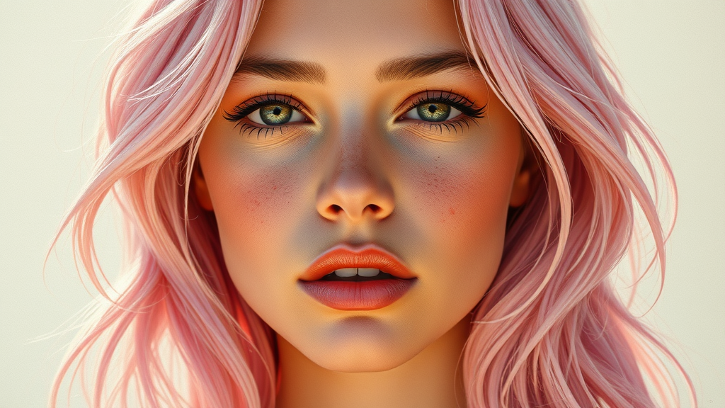 A hyper-realistic painting of a woman with soft pink hair, evoking the style of an artgerm feature, reminiscent of a Vogue journal cover showcased at the Bill Lowe Gallery. The composition is sun-drenched, using a naturalistic technique with influences from Marc Newson. Her features resemble a young Liv Tyler. Subtle freckles adorn her face, her skin gleams with a warm, golden hue, akin to a sun-kissed glow. The portrait captures an idealized vision of human beauty with a touch of Abduzeedo's signature style. She embodies a perfect female specimen, with an almost ethereal presence, slightly reminiscent of a classic, yet perfectly contemporary, Barbie doll.