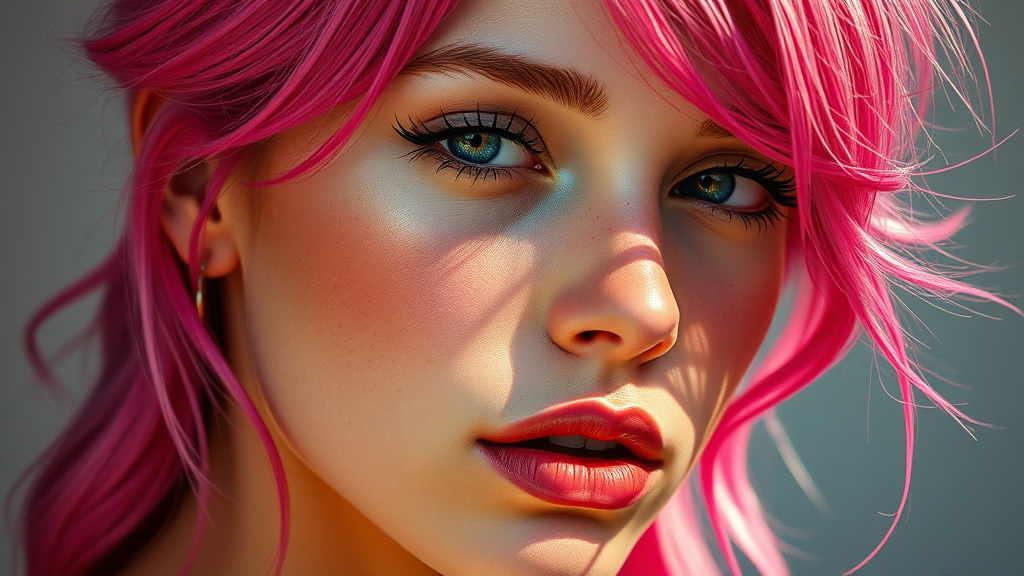 A hyper-realistic painting of a young woman with striking pink hair, reminiscent of a Vogue journal cover or an Artgerm piece, showcased in the Bill Lowe Gallery. She is bathed in sun-drenched light, highlighting a naturalistic technique akin to Marc Newson's style. Her features echo a young Liv Tyler, with soft freckles and an idealized, perfect human form. Her skin has a warm, golden hue, blending the hyper-realist style with a nod to a plastic Barbie doll aesthetic. The composition is vertical, capturing her serene yet captivating presence, as if designed by Luca and curated for Abduzeedo.