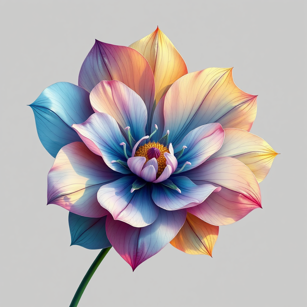 A hyper-realistic painting of an ethereal flower with intricate petals, set against a muted gray backdrop; inspired by the airbrush techniques of Ernst Haeckel. The image draws influence from cloisonnism with vibrant colors outlined in thin, bold lines, showcasing high detail and biomorphic forms that suggest organic movement, reminiscent of a style trending on ZBrush Central. The flower's curves and textures are portrayed with exceptional realism, combining the precision of digital art with an impressionistic touch that's both captivating and surreal.