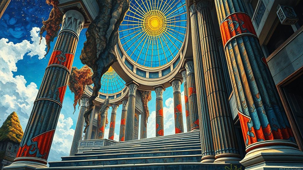 A hyper-realistic painting using fine detailed pointillism, inspired by Led Zeppelin's "Stairway to Heaven," featuring a low-angle view of a fantastical vernacular architecture with decaying Greek columns, infused with Art Deco elements. The composition is expressive, using rich jewel tones and radiating geometric patterns reminiscent of Leon Bakst, Odilon Redon, and Van Gogh. The scene incorporates gold filigree line-art with impasto techniques. Subtle white-on-white textures add depth, creating an ethereal atmosphere.