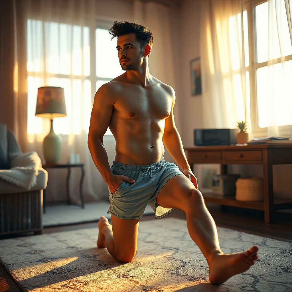 A hyper-realistic photo captured on an iPhone 14 in a cozy, well-lit room during the golden hour, featuring a handsome man with a hairy chest and short dark hair. He's wearing stylish beachwear, and the full angle shot elegantly showcases his legs and feet. The image employs ray tracing for enhanced realism, and is imbued with a nostalgic film grain reminiscent of Kodak Portra 800. The scene is softened by an f1.8 aperture, lending it an engaging depth of field as belly hair subtly catches the warm glow.
