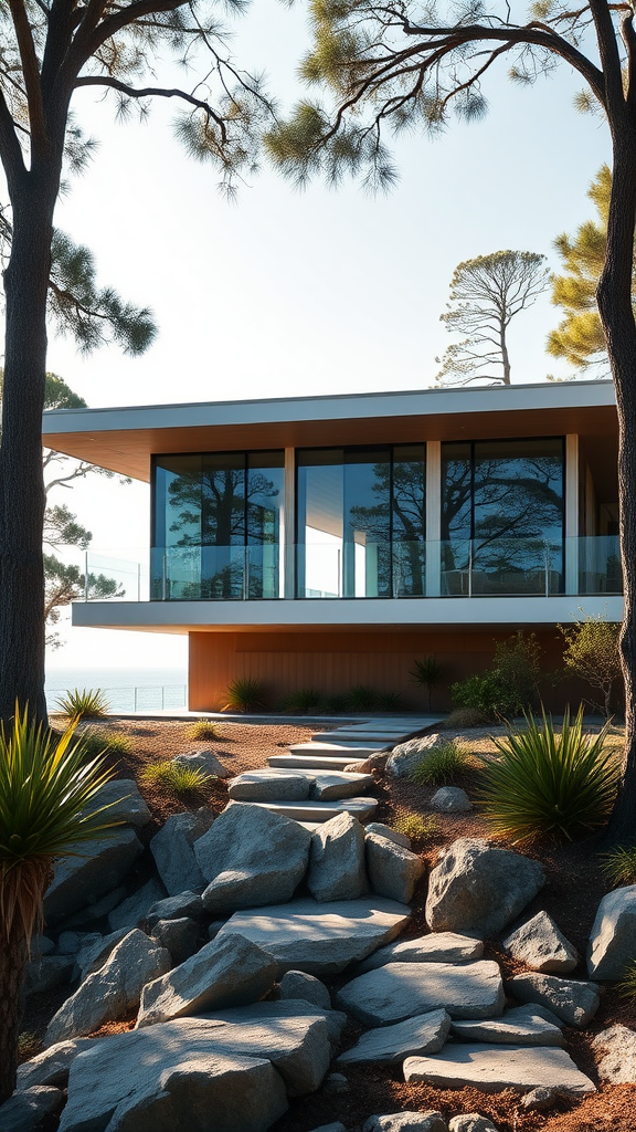 A hyper-realistic photo captures the exterior of a mid-century modern style house at eye level, showcasing a serene ocean view. The house features large glass panels, clean lines, and natural materials, harmoniously blending with its surroundings. Soft daylight filters through trees, creating indirect lighting that highlights the architectural details reminiscent of Frank Lloyd Wright, Eames, and Mies van der Rohe. A sleek, cantilevered balcony extends over the rocky shoreline, offering panoramic sea views, while native plants and minimalist landscaping enhance the building's integration with nature.