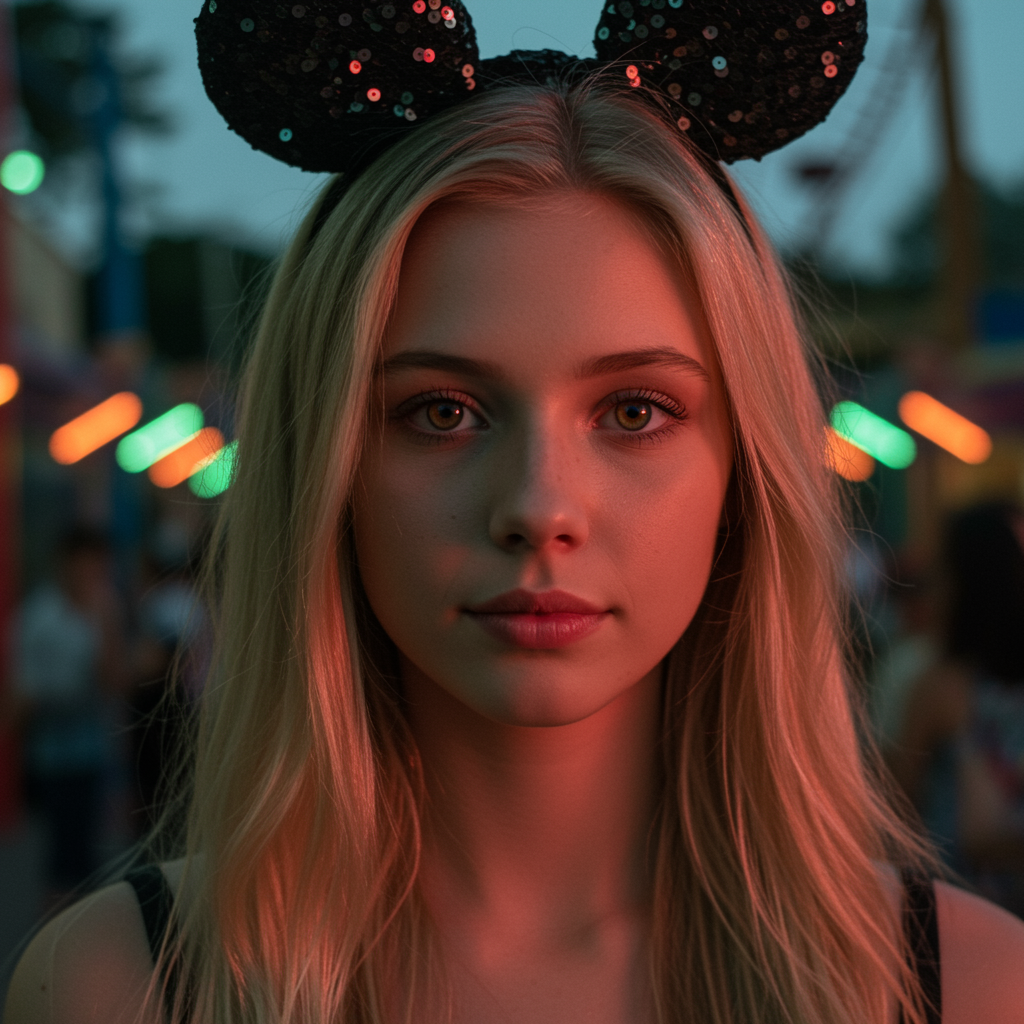 A hyper-realistic photo, capturing a beautiful 20-year-old blonde girl in a theme park, showcasing her stunning facial features under cinematic lighting. Her face is perfect with striking amber eyes and delicate features, exuding elegance and charm. The vibrant colors of the theme park create a lively backdrop, enhancing the overall artistic masterpiece. The atmosphere is filled with joy and laughter, capturing the essence of youth and beauty. This image embodies a vivid moment, effortlessly balancing realism and artistry, with a focus on captivating detail and natural beauty.