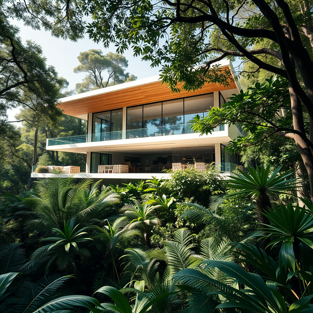 A hyper-realistic photo capturing a cutting-edge, futuristic style house at eye level, perched majestically above a lush jungle. It features sleek lines and open spaces influenced by the iconic designs of Frank Lloyd Wright, Ray and Charles Eames, and Mies van der Rohe. The structure seamlessly integrates with the environment, boasting floor-to-ceiling windows and natural materials. Daylight bathes the scene, highlighting the subtle textures and organic elements. The composition reflects the elegance and innovation of an AD magazine cover, with shadows cast by indirect lighting creating a sense of depth and harmony with nature.