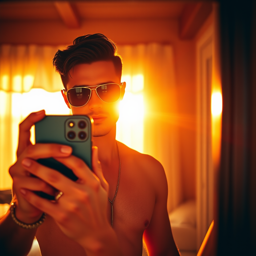 A hyper-realistic photo capturing a strikingly handsome man in stylish beachwear, wearing sleek sunglasses, taking a selfie in a mirror with the gleaming iPhone 14. His short, dark hair is neatly styled, reflecting a confident vibe. The setting is a cozy, well-lit room bathed in the warmth of golden hour light. The image exudes a nostalgic feel, reminiscent of film grain, as if shot on Kodak Portra 800 film at an f1.8 aperture. The overall composition is vivid and inviting, drawing the viewer into a serene yet vibrant summer moment.