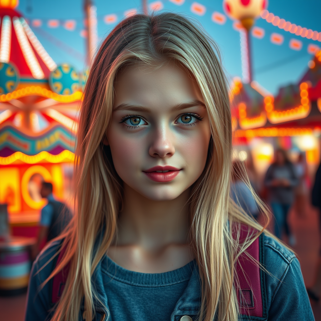 A hyper-realistic photo of a stunning 20-year-old blonde girl at a theme park, showcasing beautiful facial features with cinematic lighting. The image captures her perfect, captivating face with exquisite detail in a picturesque setting. Surrounded by vibrant, saturated colors, the photo radiates warmth and joy. Her expression is serene and charming, and her bright amber eyes glimmer with life. The setting is dynamic, filled with vivid attractions and lively atmosphere. Her outfit complements the vibrant environment, enhancing the overall harmony of the composition. The image is crystal-clear, boasting sharp quality and impressive depth, truly reflecting a masterpiece of photographic art.