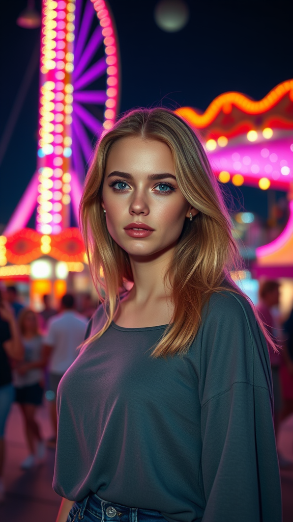 A hyper-realistic photo of a stunning 20-year-old blonde girl at a theme park. She has captivating facial features, a perfect face, and is illuminated by cinematic lighting. The image showcases vibrant colors and an ultra-realistic atmosphere. Against the backdrop of a lively theme park, she stands with confidence, her outfit blending seamlessly with the scene. The ambiance is vivid and lifelike, capturing the joy and excitement of the park, with attractions and lights slightly blurred to emphasize her presence. Despite the bustling surroundings, she remains the focal point of this masterpiece photograph.