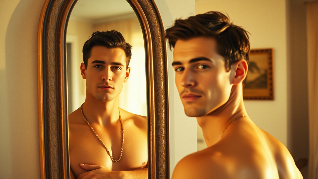 A hyper-realistic photograph captures a strikingly handsome man in stylish beachwear, his confident pose reflected in a mirror, taken with the latest iPhone. The scene is set in a warm, inviting room filled with natural light, enhancing the man's short, dark hair and perfect complexion. The captivating image features a subtle film grain texture, reminiscent of Kodak Portra 800 film, with the soft, golden glow of the golden hour adding depth and warmth. The photograph is shot at f1.8, subtly blurring the background to focus on the subject and highlight the scene's cozy yet vibrant ambiance.
