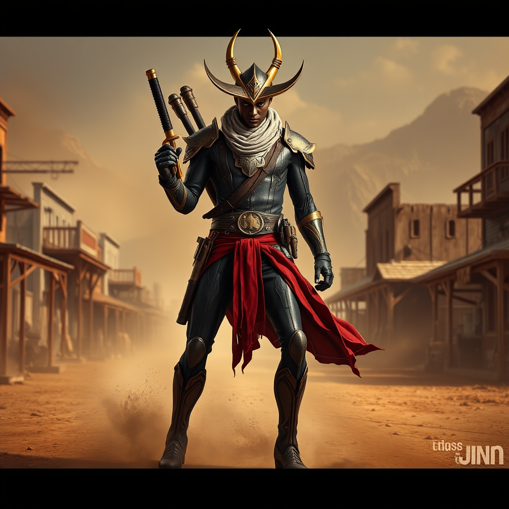 A hyper-realistic photograph captures High Noon Jhin standing amidst a dusty, desolate Wild West town, his slender and agile physique accentuated by intricate costume details and his signature weapons. Advanced lighting techniques highlight his stoic and determined expression, conveying a powerful sense of justice and retribution. His presence is framed by a warm earthy color palette, interspersed with striking pops of red, gold, and black. The dynamic pose of High Noon Jhin, with a slight creative twist in the design of his attire, remains true to his unrelenting and righteous nature, blending seamlessly into the rustic ambiance of the frontier landscape.
