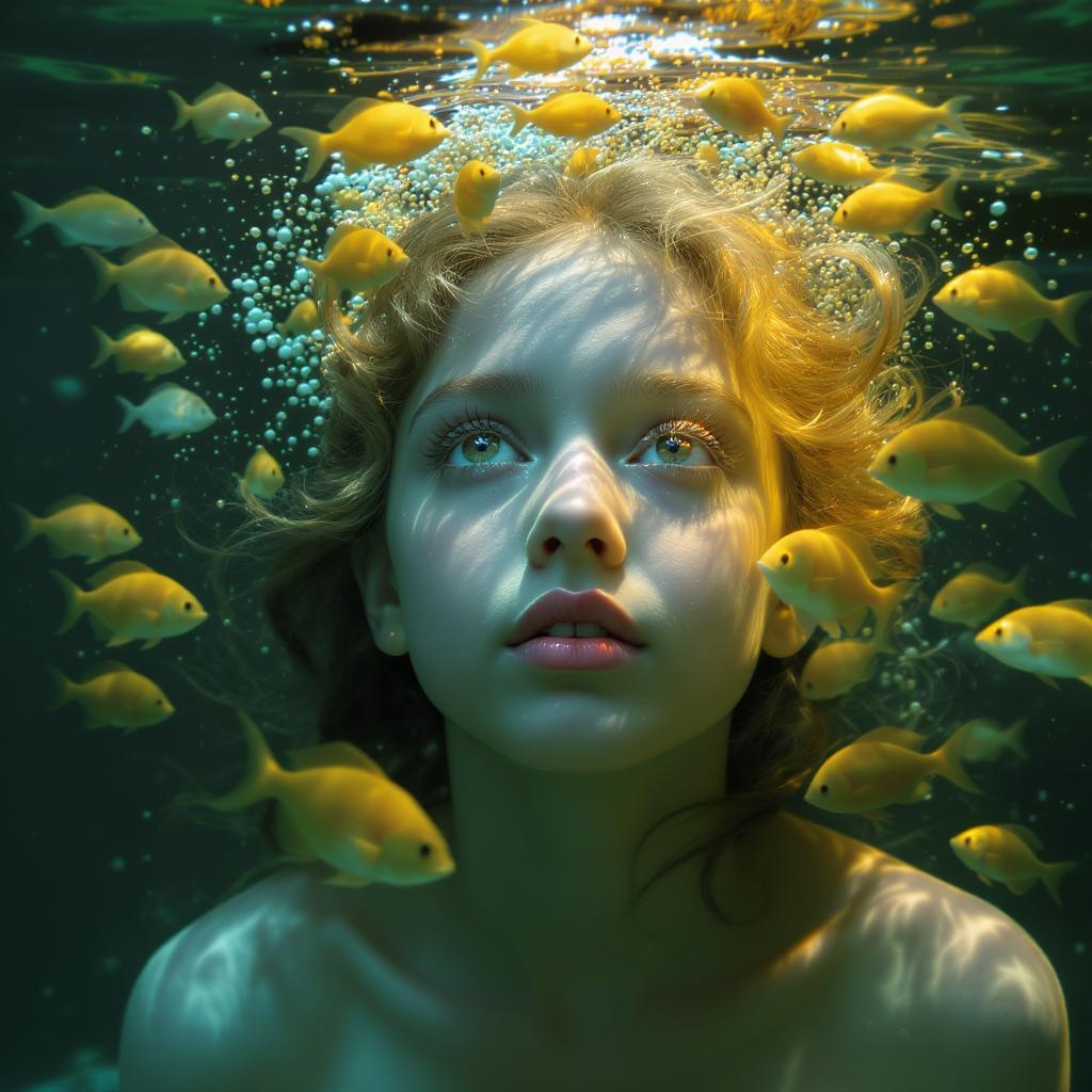 A hyper realistic photograph capturing an enchanting moment of a girl submerged in water surrounded by a swirling school of radiant golden fish, closeup shot revealing her serene expression in a dreamy, ethereal mood, with shimmering bokeh reflections dancing around. The play of light casts a gentle, warm glow on her face as if touched by the golden hour's embrace, mesmerizingly beautiful and awe-inspiring. 8k resolution, with a touch of whimsical tranquility and a hint of magical chaos in the scene, showcasing her presence in an underwater wonderland.