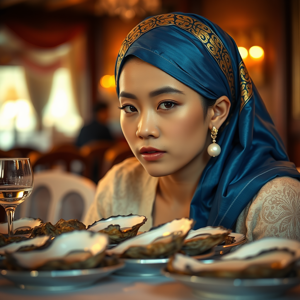 A hyper-realistic photograph capturing Sei-Gwpe seated at a beautifully set table adorned with fresh oysters glistening under the warm, cinematic lighting. The scene is sharp and detailed, shot with a 50mm lens to emphasize the exquisite textures and colors. Sei-Gwpe wears a lustrous pearl earring that catches the light subtly, and a striking blue and gold headscarf gently frames their face, adding an elegant touch to the composition. The atmosphere is both intimate and vibrant, evoking a sense of refined luxury and timeless beauty.