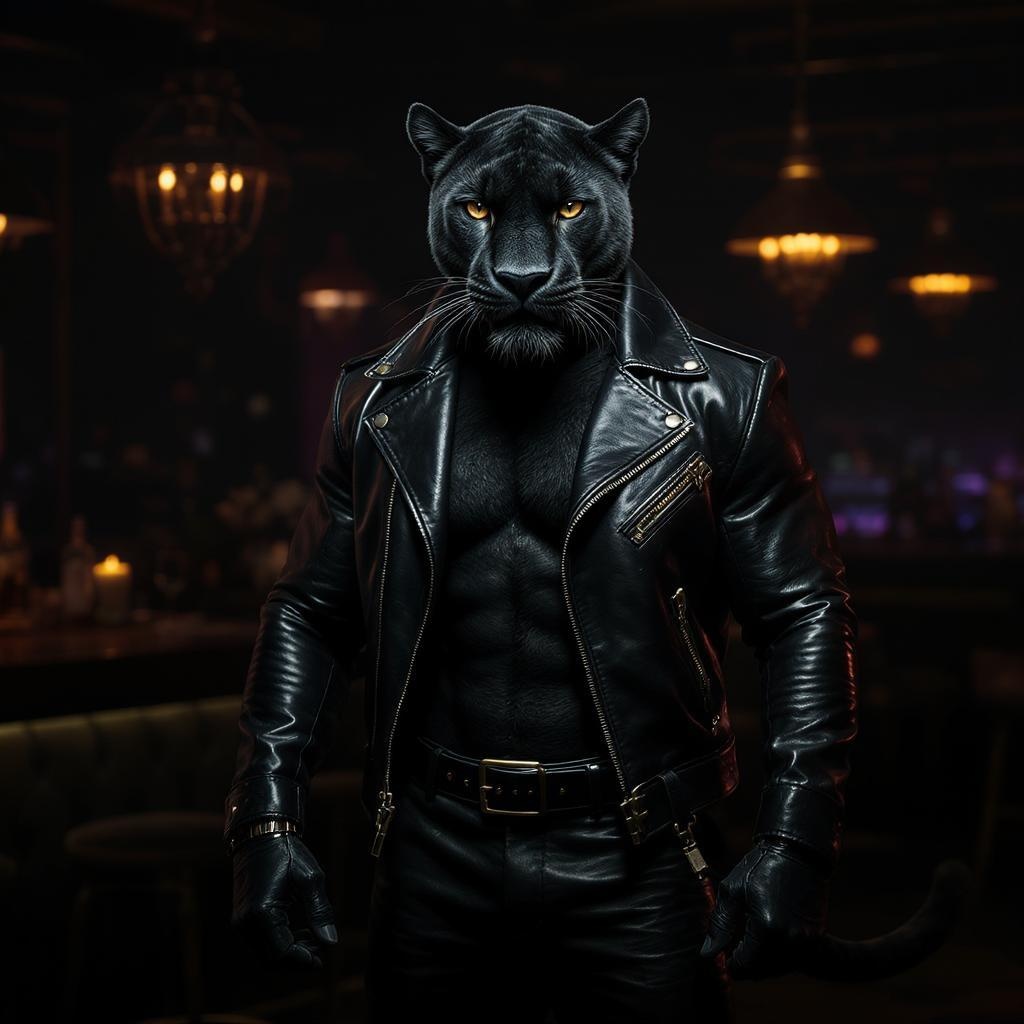 A hyper realistic photograph depicts a magnificent anthropomorphic panther, exuding strength and elegance, clad in a sleek modern biker outfit. Set in a chic midnight bar, the scene captures an air of intrigue and admiration. The panther's athletic physique is accentuated by the leather attire, complementing the dimly lit ambiance, which bathes the room in a dark, moody glow. Every detail, from the sheen of the outfit to the texture of the panther's fur, is captured in exquisite sharpness. This hyper emotional and epic composition, shot in 32k UHD resolution, utilizes the Hasselblad H6D 400c Multi Shot and Mitakon Speedmaster 35mm f/1.2 XCD, ensuring the highest fidelity in capturing the scene's grandeur, evoking a lasting sense of wonder and respect.