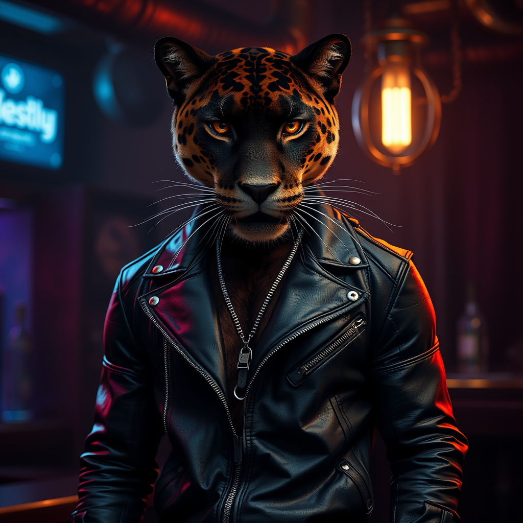 A hyper realistic photograph of a captivating anthropomorphic panther with a modern athletic physique, dressed in a sleek biker outfit, standing confidently in a dimly lit midnight bar. The breathtaking composition evokes a sense of awe and admiration, with hyper detailed textures capturing the essence of fur, leather, and metal. The scene is imbued with intense emotion, highlighted by epic dark lighting that casts intriguing shadows. Captured in stunning 32k UHD resolution with the renowned Hasselblad H6D 400c Multi Shot camera, using the Mitakon Speedmaster 35mm f/1.2 lens to create a mystical aura with beautifully blurred backgrounds. The atmosphere is moody yet inviting, showcasing the panther's piercing eyes and charismatic presence.