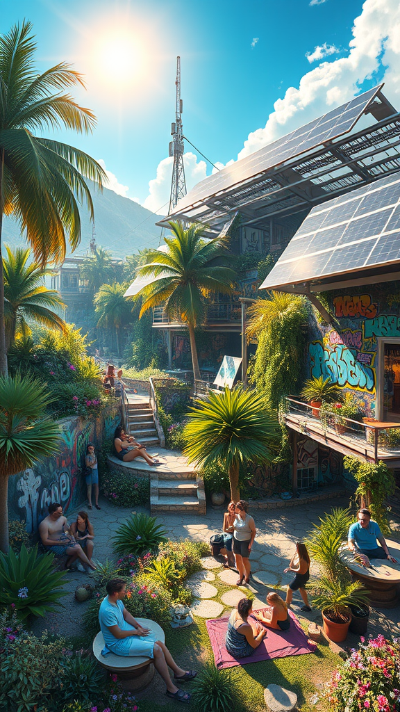 A hyper-realistic photograph of a solarpunk paradise on a summer's day, celebrated as a masterpiece on art platforms, captured in stunning 8k resolution. The scene bursts with vibrant graffiti art, abundant fine detailing, and a kaleidoscope of colors. Intricately designed with a harmonious balance, the composition follows the golden ratio. The landscape is adorned with lush greenery intertwined with futuristic eco-friendly architecture, solar panels glistening under the sun. People lounging, enjoying nature and art, contribute to an atmosphere of relaxed innovation and community connection, where technology and environment coexist beautifully.