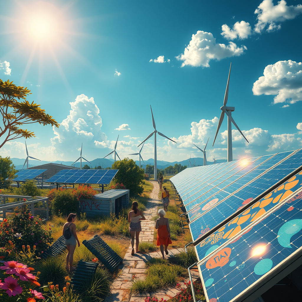 A hyper-realistic photograph of a solarpunk summer day filled with vibrant energy, reminiscent of a masterpiece trending on Artstation. This 8k image captures a dazzling scene painted with intricate graffiti, showcasing fine details and a kaleidoscope of colors. The composition adheres to the golden ratio, weaving together lush greenery, futuristic architecture, and harmonious human interactions in this utopian landscape. Flashes of sunlight dance across solar panels, casting playful shadows, while wind turbines gently rotate in the background. A serene atmosphere envelops the scene, highlighting the contrast between nature and technology in perfect coexistence.