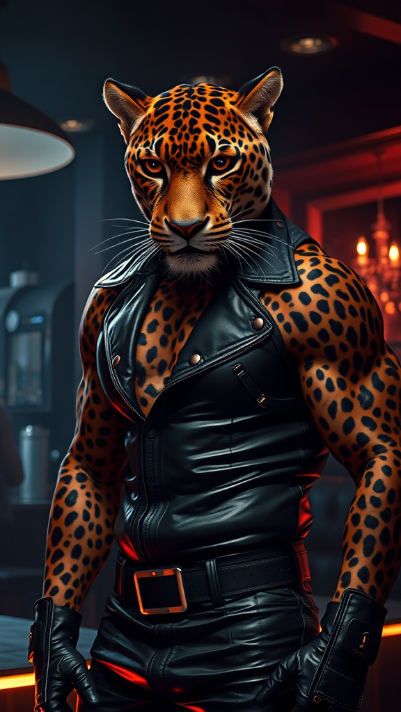 A hyper realistic photograph of a striking anthropomorphic leopard, exuding strength and allure, dressed in a sleek biker outfit inside a dimly lit, upscale midnight bar. The composition captures an atmosphere of deep admiration, showcasing meticulous attention to detail with a hyper emotional undertone. The epic dark lighting accentuates the muscular physique and smooth textures of the character, shot in ultra-high-definition 32k UHD resolution. Captured on a Hasselblad H6D 400c Multi-Shot with a Mitakon Speedmaster 35mm f/1.2 XCD lens, the image holds a balance of intensity and sophistication, depicting a blend of modern athleticism and enigmatic charm.