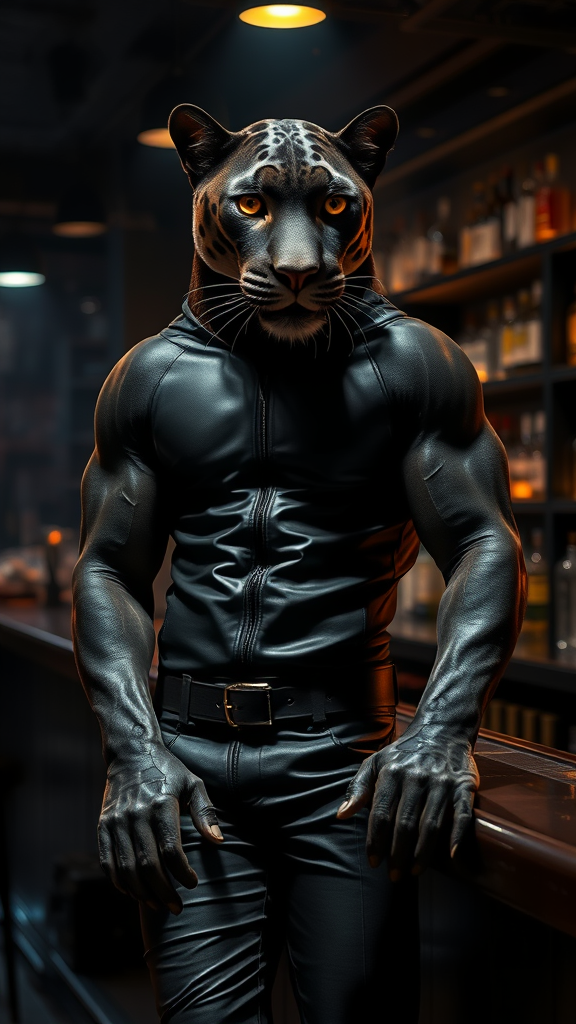 A hyper realistic photograph of a striking anthropomorphic panther with a powerful athletic build, clad in a sleek biker outfit, leaning confidently against the polished counter of a dimly lit midnight bar. The scene captures a sense of awe and admiration, with the panther's eyes gleaming intensely in the ambient light. The composition is meticulously detailed, highlighting every contour of the muscled form and the textured fabric of the outfit. The setting exudes an air of mystery and sophistication, with epic dark lighting casting dramatic shadows. The image, shot on a Hasselblad H6D 400c Multi-Shot with a Mitakon Speedmaster 35mm f/1.2 XCD lens, achieves a stunning 32k UHD resolution, enveloping the viewer in a hyper emotional visual experience. The atmosphere is enhanced by slight creative additions such as subtle reflections on the bar counter and a warm, glowing light behind the shelves of liquor bottles, adding depth and allure to the scene.