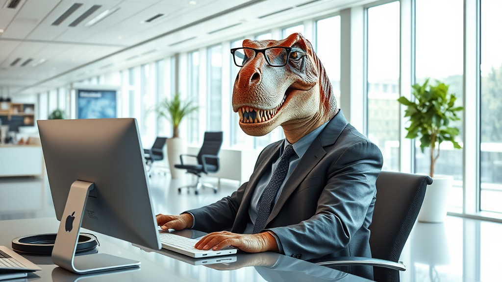 A hyper realistic photograph of a T-Rex seated in a brightly lit, modern office, intently using a sleek computer. The dinosaur is dressed in a well-tailored suit and tie, with stylish glasses perched on its snout. The room is spacious, with large windows filling the space with natural light, and contemporary decor adding to the professional atmosphere. Captured in a wide angle shot, the full body of the T-Rex is in view, highlighting its massive yet oddly sophisticated presence in the workplace. The image is in 8k resolution, showcasing every intricate detail in high definition, maintaining the core concept of a prehistoric creature engaged in a contemporary business setting.