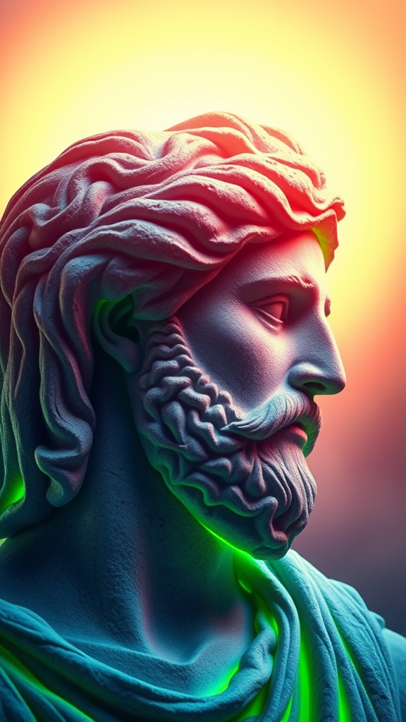 A hyper-realistic photograph of an ancient Greek statue with its head in profile, surrounded by a glowing halo of light. The statue is adorned with neon green accents, highlighting its intricate details and textures, creating a vivid contrast between the classic stone structure and the modern, vibrant color scheme. The background features soft, blurred colors that complement and enhance the statue's ethereal and timeless essence.