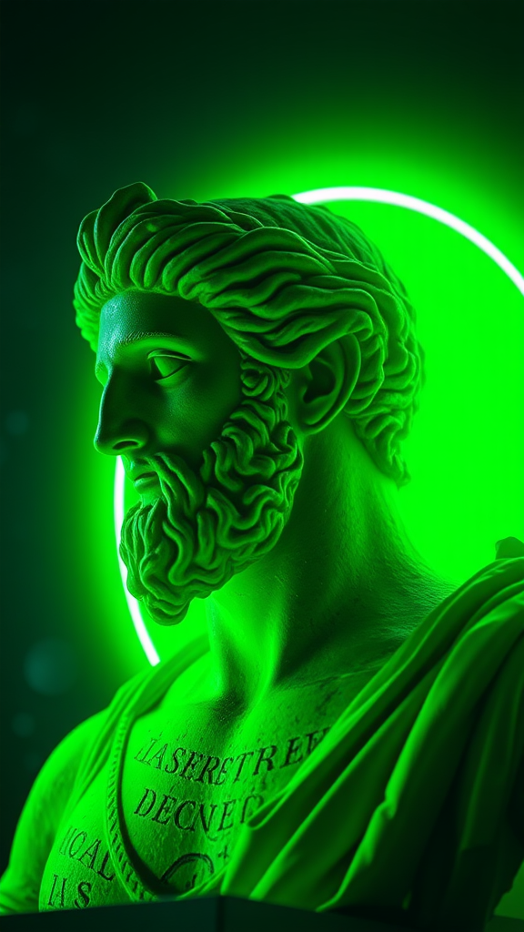 A hyper-realistic photograph of an ancient Greek statue, its head turned in profile, surrounded by a vibrant halo of neon green light, the intricate details of the sculpture accentuated with every curve and texture meticulously captured, the radiant green glow casting dynamic shadows and reflections that dance across the scene, blending classical elegance with modern visual dynamism.