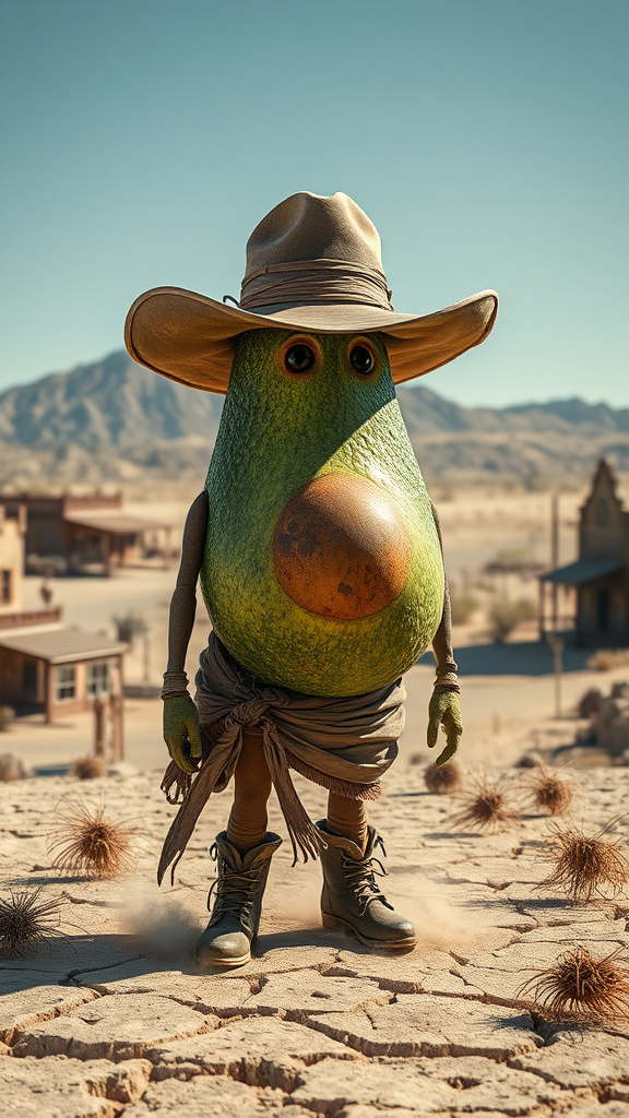 A hyper-realistic, photographic 8k movie still portrays a desperado with the appearance of a rugged avocado, set in a sun-drenched wild west scene. The scene captures intricate details of the avocado's textured skin, resembling the weathered face of an outlaw. Dusty tumbleweeds roll across the parched, cracked earth as the avocado desperado stands confidently, wearing a tattered cowboy hat and a weathered leather duster. In the background, a dusty frontier town with wooden saloons and a distant mountain range stretches towards the horizon under a clear blue sky.