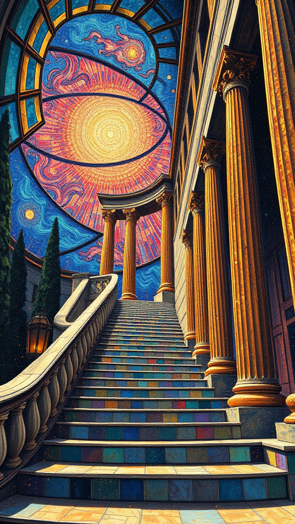 A hyper-realistic pointillism painting inspired by Led Zeppelin's Stairway to Heaven, viewed from a low angle, depicting fantasy vernacular architecture with aged Greek columns and art deco elements. The scene is expressive and vibrant, featuring rich jewel tones and radiating geometric patterns reminiscent of Leon Bakst and Odilon Redon, infused with Van Gogh's swirling energy. Intricate gold filigree line-work weaves through the composition, enhanced by textured impasto and subtle white-on-white contrasts, creating a dreamlike ascent to the heavens with an imaginative twist.
