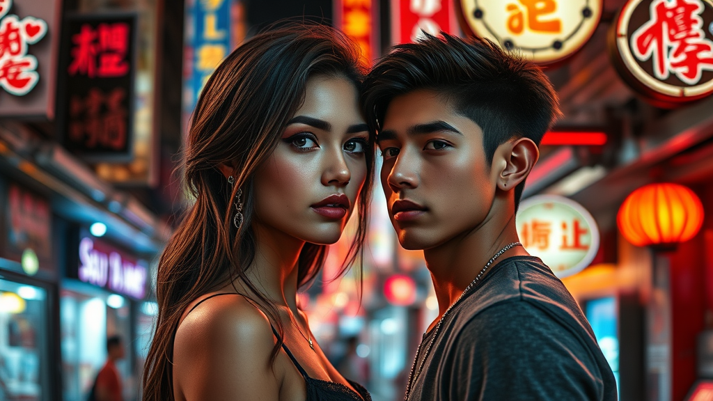 A hyper-realistic portrait capturing a stunning young supermodel duo, a girl and boy standing face to face with a romantic spark. Set against a bustling Asian market backdrop illuminated by vibrant neon signs, the scene is brought to life under the enchanting glow of night city lights. The girl, possessing mesmerising green eyes, boasts a sculpted, fitness-perfect physique with elegantly long legs and a flawlessly symmetrical face. Her expressive doe eyes and delicate freckles enhance her natural beauty, framed by her long, silky hair that flows like ink. Her makeup, subtle yet accentuating, complements her high cheekbones. The cinematic, ultra-HD capture is styled with a wide aperture of 1.8, creating a dreamy bokeh effect accentuated by lens flare, giving the photograph its extradimensional feel. Both figures display a poetic melancholy, set in sharp, highly detailed contrast against the lively market scene filled with glimmers of neon.