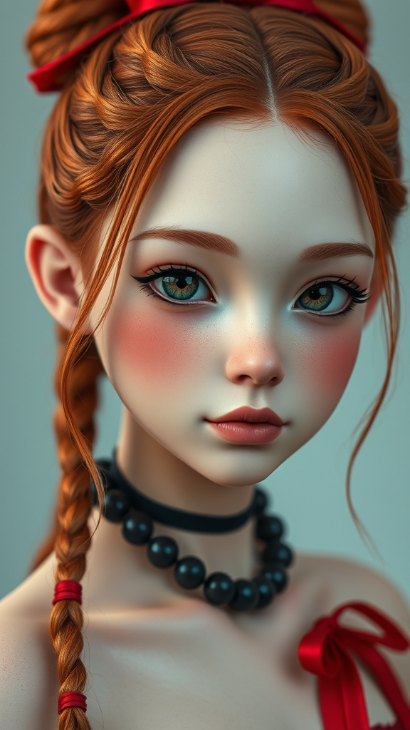 A hyper-realistic portrait featuring a character with red hair braids and a cute face, adorned with a black bead necklace. The subject has soft pale cheeks and smooth skin, enhanced with a red ribbon adding charm. Captured in a studio setting with sharp focus, the image presents intricate details and a perfect composition reminiscent of Greg Rutkowski's style. The photography is in 8k, with UHD and HDR quality, emphasizing remarkable textured skin and detailed pupils. The portrait is captured with a cinematic camera lens, ensuring clarity and high detail in every aspect. Avoiding any form of disfigurement or distortion, the image maintains natural anatomy and lifelike proportions, resulting in a visually stunning and aesthetically pleasing artwork without any digital artifacts or errors.