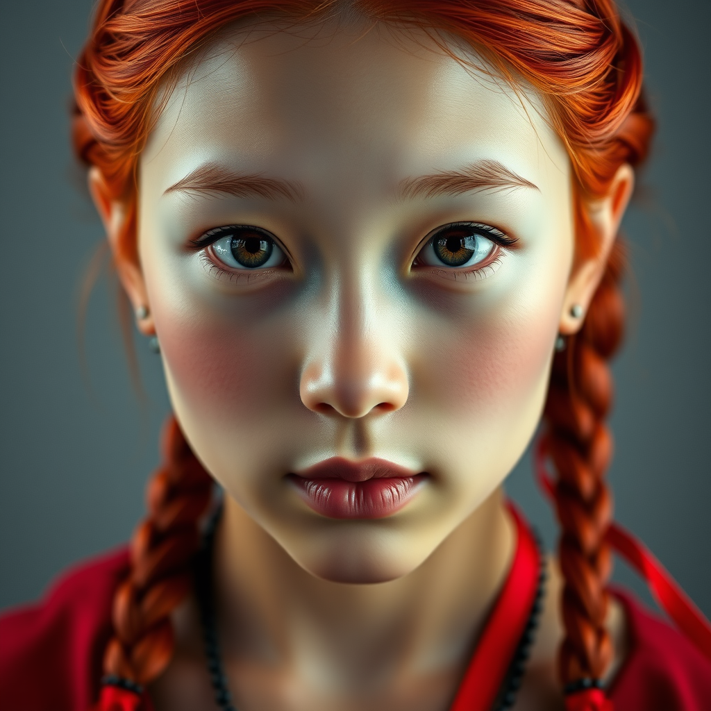 A hyper-realistic portrait featuring a person with vibrant red hair styled in braids, adorned with a black bead necklace and a red ribbon. The subject has a cute face with soft pale cheeks, smooth skin, and remarkably detailed pupils. Captured with sharp focus and intricate details, the image boasts 8k resolution, offering a high-quality, cinematic feel typical of studio photography. The composition reflects the meticulous artistry of Greg Rutkowski, rendering an ultra-detailed representation that is trending on ArtStation. The studio lighting enhances the texture of the skin, bringing out the depth and personality of the subject, resulting in a visually stunning depiction.