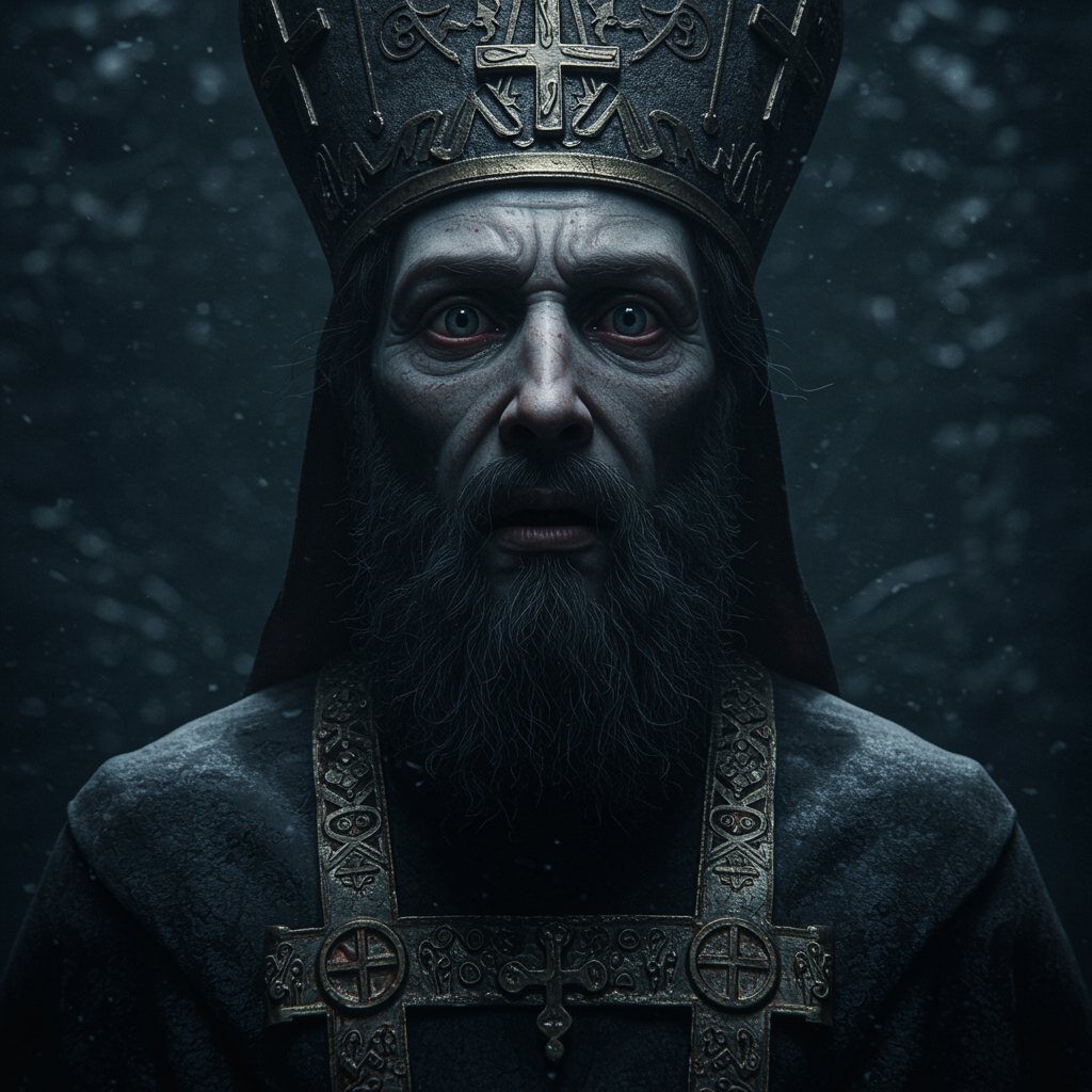 A hyper-realistic portrait from the dark kingdom featuring a figure with intricately symbolic orthodox attire. His large, terrified eyes convey a sense of horror and depth, captured with stunning detail using a Hasselblad H4D 200MS Digital Camera and a Mitakon Speedmaster 65mm f/1.4 XCD lens. The scene is enhanced with dramatic Fresnel lighting, emphasizing the texture and symbolism of his clothing. The composition has a unique aspect ratio of 1:2, gazing into a mysterious, haunting atmosphere.