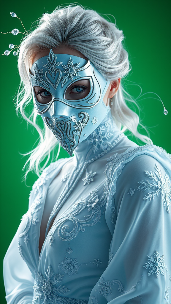 A hyper-realistic portrait in 8K of a woman wearing a full mask sculpted from shimmering iridescent mother-of-pearl and frost, with delicate crystal formations branching symmetrically along the edges. She is adorned in a flowing gown of luminous moonlit blue and white silk, intricately embroidered with intricate frost-encrusted snowflake motifs, the fabric shimmering as if kissed by gossamer. The gown moves as if caught in a gentle, lunar breeze, creating an ethereal sense of motion. Her hair, a tumble of silken silver waves, glimmers softly, contrasting with her pale, alabaster-like skin that radiates a subtle, lunar frost-kissed glow. The background is a deep emerald green, a surreal contrast to the icy elements of her attire, creating a striking visual harmony that makes her luminous elegance stand out. Soft, silver-tinted lighting accentuates the delicate details of her mask and the luminous shimmer of her gown, enveloping her in an aura of ethereal beauty and mystery.