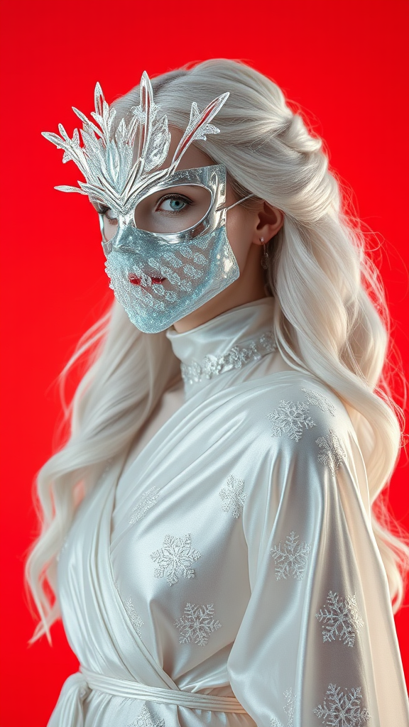 A hyper-realistic portrait in HD, 8K, featuring a woman adorned in a sculptural mask crafted from glistening ice and frost. The mask is sleek and translucent, adorned with intricate crystal formations that branch asymmetrically, echoing the fractal patterns of frozen water. She wears a flowing gown of luminous silver and iridescent white silk, embroidered with delicate snowflake motifs, the fabric shimmering as if touched by frost. The gown moves as if gently stirred by an eternal, soft winter breeze, creating an ethereal sense of fluidity. Her hair cascades in a series of silken white waves, complementing her pale, porcelain-like skin that emits a subtle, frost-kissed glow. The background is a vivid orange-red, providing a surreal contrast to the icy elements of her attire and enhancing her frozen elegance. Soft, cool lighting highlights the delicate details of her mask and the shimmering ice-like quality of her gown, enveloping her in an aura of magical, otherworldly winter beauty.