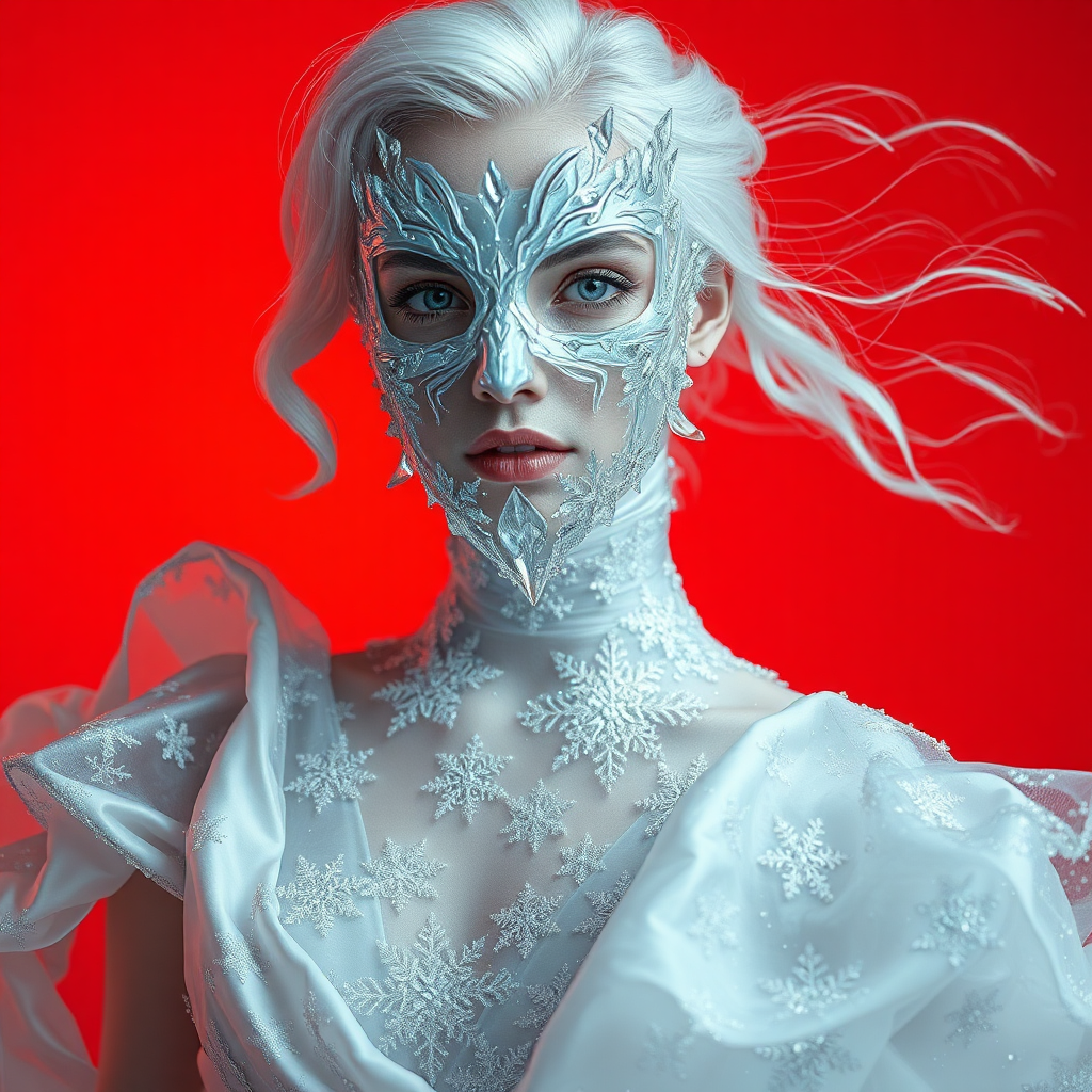 A hyper-realistic portrait, in HD, 8K, of a woman adorned in a mask sculpted from glistening ice and frost. The mask is smooth and almost invisible, with intricate crystal formations flowing asymmetrically along the edges, resembling intricate fractal patterns of frozen water. She is dressed in a flowing gown of shimmering silver and white silk, intricately embroidered with delicate snowflake motifs, the fabric sparkling as if it had been kissed by frost. The gown moves gently, as if caught in an eternal, soft winter breeze, creating an ethereal sense of motion. Her hair, a cascade of silken white waves, shimmers faintly, harmonizing with her pale, porcelain-like skin that emits a subtle, frost-like glow. The background is a bold orange-red, creating a surreal contrast to the icy elements of her attire, highlighting her frozen elegance. Soft, cool lighting emphasizes the translucent details of her mask and the icy shimmer of her gown, enveloping her in a captivating aura of otherworldly magic and pristine winter beauty.