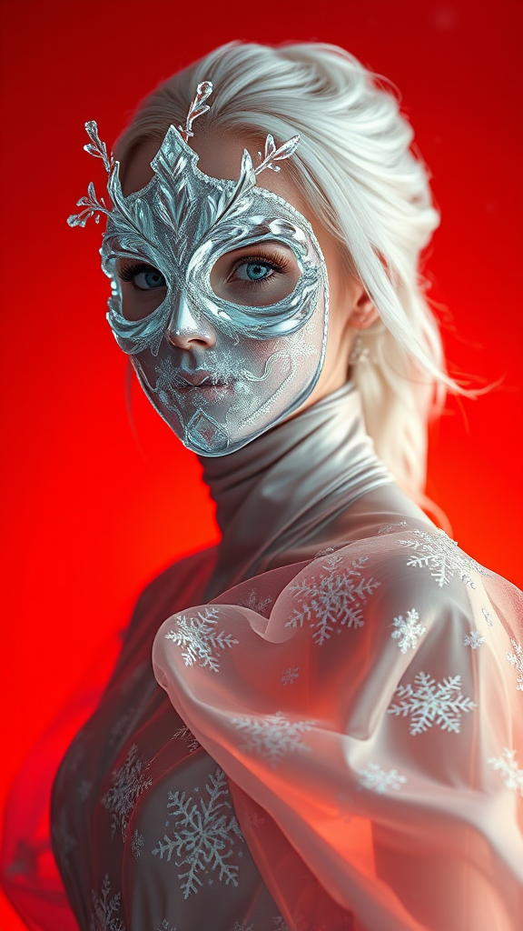 A hyper-realistic portrait, in HD, 8K, of a woman wearing a mask sculpted from glistening ice and frost. The mask is smooth and semi-transparent, with intricate crystal patterns branching asymmetrically along the edges, reminiscent of frozen fractals. She is dressed in a flowing gown of radiant silver and white silk, embellished with delicate snowflake designs, the fabric shimmering like it's touched by frost. The gown seems to move with a perpetual, gentle winter breeze, creating an ethereal sense of movement. Her hair, a cascade of silky white waves, shimmers slightly, enhancing her pale, porcelain-like skin that emits a faint, frost-kissed radiance. The background is a vivid orange-red, offering a surreal contrast to her icy attire, creating a captivating visual balance that highlights her frozen elegance. Soft, chilly lighting accentuates the mask's translucent details and the gown's icy shimmer, surrounding her in an aura of otherworldly enchantment and pristine winter beauty.