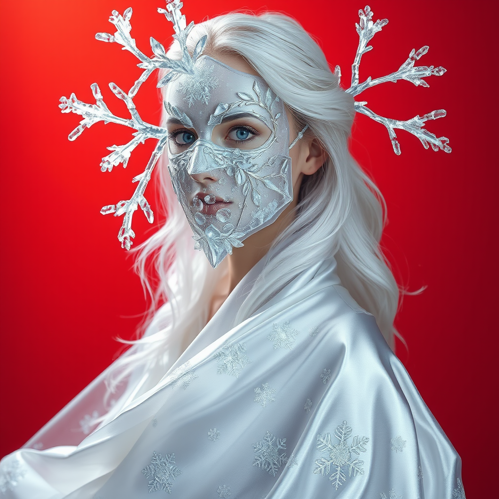 A hyper-realistic portrait, in HD, 8K, of a woman wearing a mask crafted from glimmering ice and frost. The mask has a smooth, translucent quality, with intricate crystal formations branching asymmetrically along the edges, resembling intricate fractal patterns of frozen water. She is draped in a flowing gown of radiant silver and white silk, adorned with delicate snowflake motifs, the fabric sparkling as if touched by frost. Her gown appears to drift as if caught in an eternal, gentle winter breeze, imparting an ethereal sense of movement. Her hair, cascading in silken white waves, shimmers subtly, complementing her alabaster skin that emits a soft, frost-touched glow. The background is a vivid orange red, creating a striking contrast to the icy elements of her ensemble, enhancing her frozen elegance. Soft, cool lighting emphasizes the translucent aspects of her mask and the icy shimmer of her gown, enveloping her in an aura of otherworldly magic and pristine winter beauty.